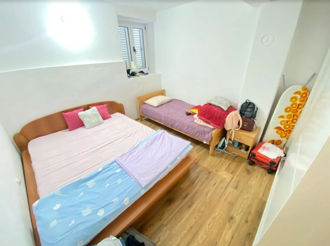 Na prizemlju se nalazi hodnik, dnevni boravak sa kuhinjom i trpezarijom, dvije spavce sobe i kupatilo, dok se bna drugoj etazi takodje nalazi stan sa dvije spavace sobe, hodnikom , dnevnim boravkom sa kuhinjom i trpezarijom,, kupatilom i terasom sa koje se pruza pogled na more.