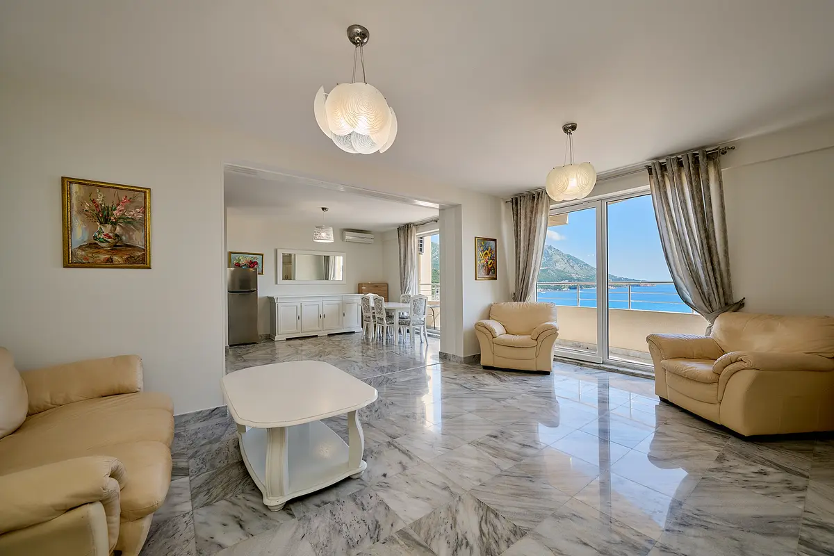 Na svega 500 metara udaljenosti od hotela Splendid, u Becicima, prodaje se komforan trosoban stan sa panoramskim pogledom na more. Sa ukupnom površinom od 113 m², stan se nalazi na trecem spratu i ima dobro osmišljen raspored koji uključuje tri spavaće sobe, tri kupatila, vešeraj, kao i prostrani dnevni boravak spojen sa kuhinjom. Prostrana terasa sa pogledom na more i dodatna terasa sa pogledom na planine nude idealne uslove za odmor i uživanje u okolnoj ljepoti.
